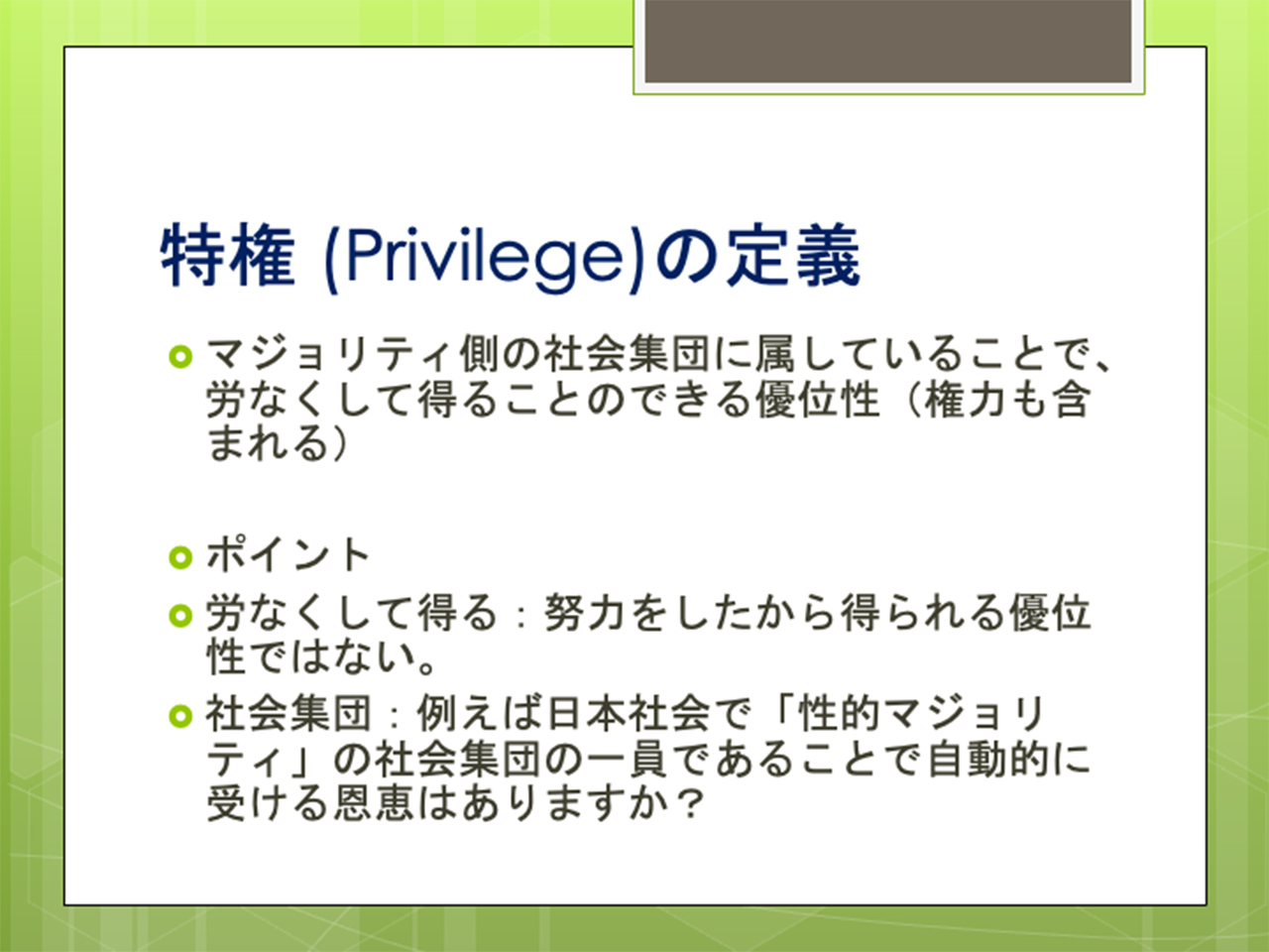 『特権(Privilege)』とは、マジョリティ側の社会集団に属していることで、労なくして得ることのできる優位性のことです。言い換えれば、「努力の結果ではなく、たまたまある社会集団の一員として生まれたことで、自動的に手にする恩恵」です。
